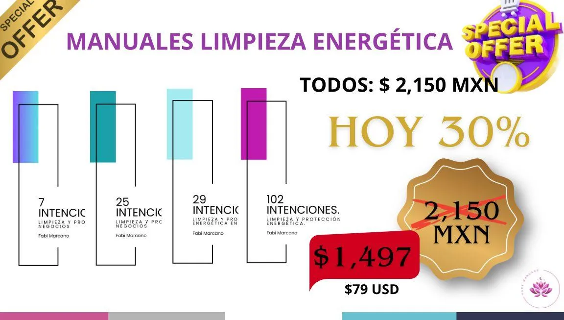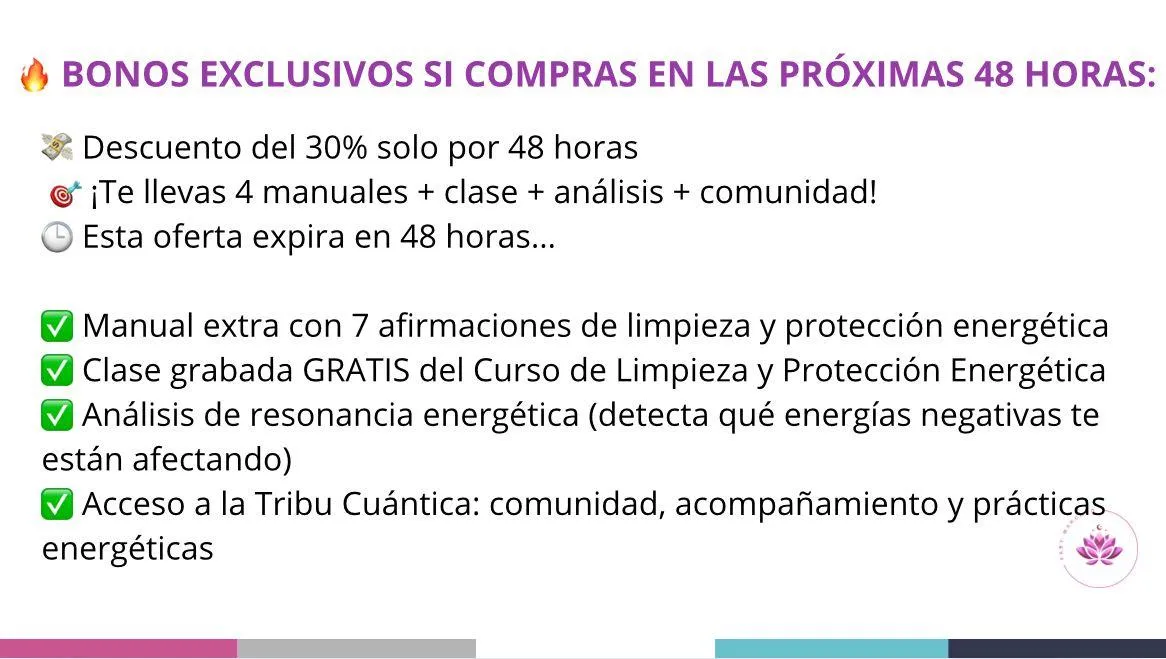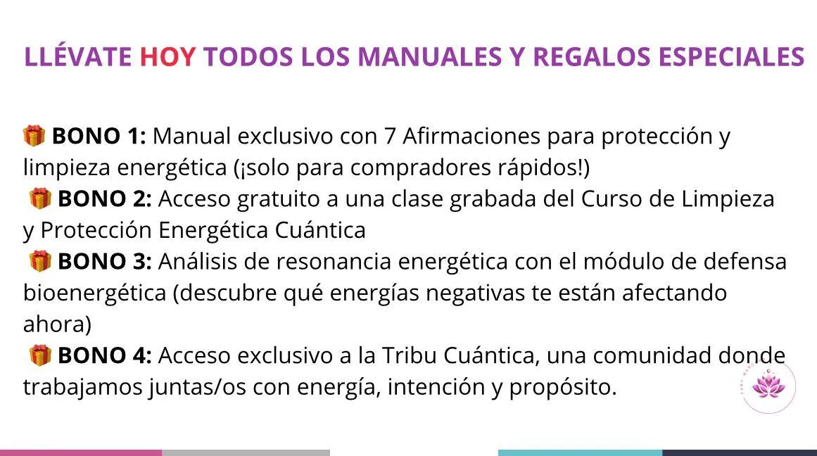 Incluye 4 manuales en PDF con intenciones y afirmaciones para proteger tu energía y la de tus espacios, presentaciones en pdf y seguimiento por medio de la comunidad.